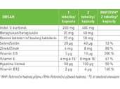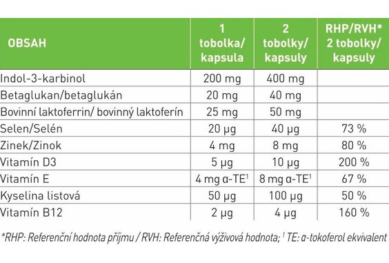 Indol-3-karbinol (štandardizovaný extrakt z brokolice (Brassica oleracea L. var. italica Plenck); jedlá želatína; beta-glukán z kvasiniek Saccharomyces cerevisiae; bovinný laktoferín (z mlieka); protihrudkujúca látka: horečnaté soli mastných kyselín; vitamín E (DL-α-tokoferyl-acetát); oxid zinočnatý; seleničitan sodný; vitamín D3 (cholekalciferol); vitamín B12 (kyanokobalamín); kyselina listová (kyselina pteroylmonoglutámová).
