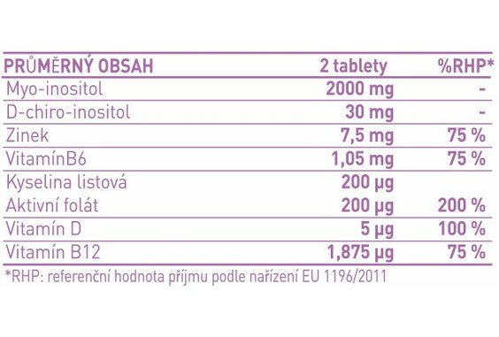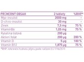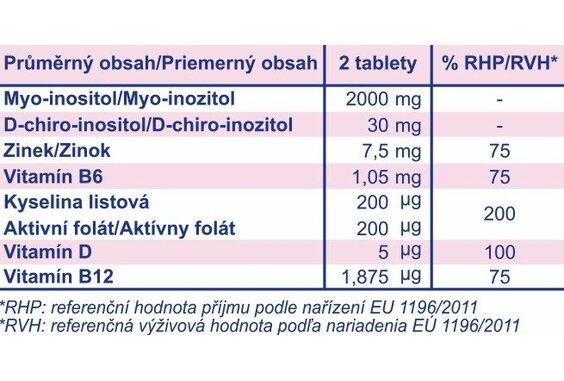Myo-inozitol; plnivo: celulóza; glukónan zinočnatý; protihrudkujúce látky: oxid kremičitý, horečnaté soli mastných kyselín; d-chiro-inozitol; vitamín D (kolekalciferol); vitamín B12 (kyanokobalamín); vitamín B6 (pyridoxínhydrochlorid); aktívny folát (L-metylfolát vápenatý); kyselina listová (kyselina pteroylmonoglutámová).