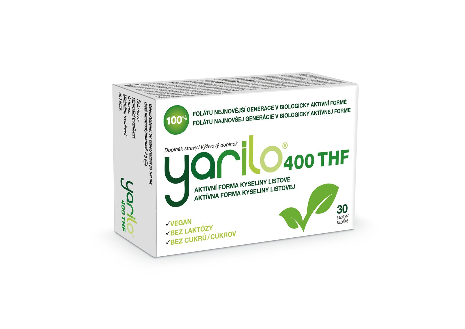 Jedna tableta Yarilo® 400 THF obsahuje 400 µg plne biologicky aktívneho folátu najnovšej generácie. Na rozdiel od obyčajnej kyseliny listovej je okamžite účinný a nemusí sa metabolizovať pomocou enzýmu MTHFR. Pri užívaní tejto 100 % aktívnej formy kyseliny listovej sa v organizme neobjavuje nemetabolizovaná kyselina listová (UMFA - unmetabolised folic acid).